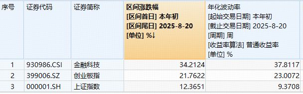 注:统计区间2025.1.1-2025.8.20。中证金融科技主题指数基日为2014.6.30,发布日期为2017.6.22,2020-2024年年度涨跌幅分别为:10.46%、7.16%、-21.40%、10.03%、31.54%。指数成份股构成根据该指数编制规则适时调整,其回测历史业绩不预示指数未来表现。