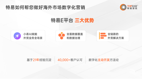 作为跨境贸易数字化服务先行者,特易资讯构建 “工具 + 内容 + 服务” 全链路赋能体系。“易学客” 外贸学习平台上线 分钟实战课程,覆盖海关数据应用、跨境合规、社媒营销等核心模块,助力企业提升团队数智化运营能力;以上海为总部,在南京、苏州等 12 城布局直营机构,配置 200 + 名平均从业经验超 10 年的专业顾问,提供本地化、定制化服务。